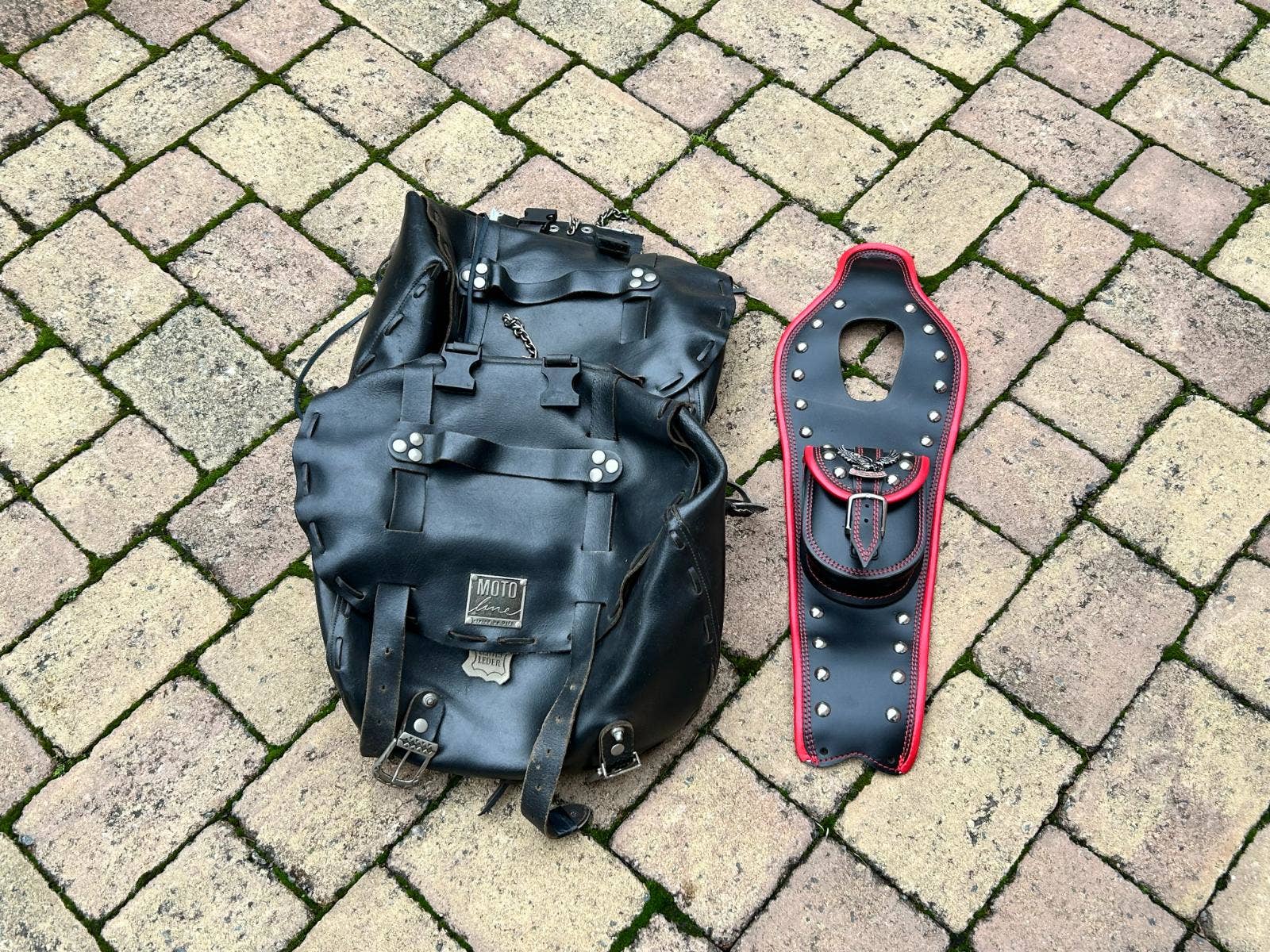 Doplňky – padací rám, podpěry a brašny, kožený pás na nádrž.