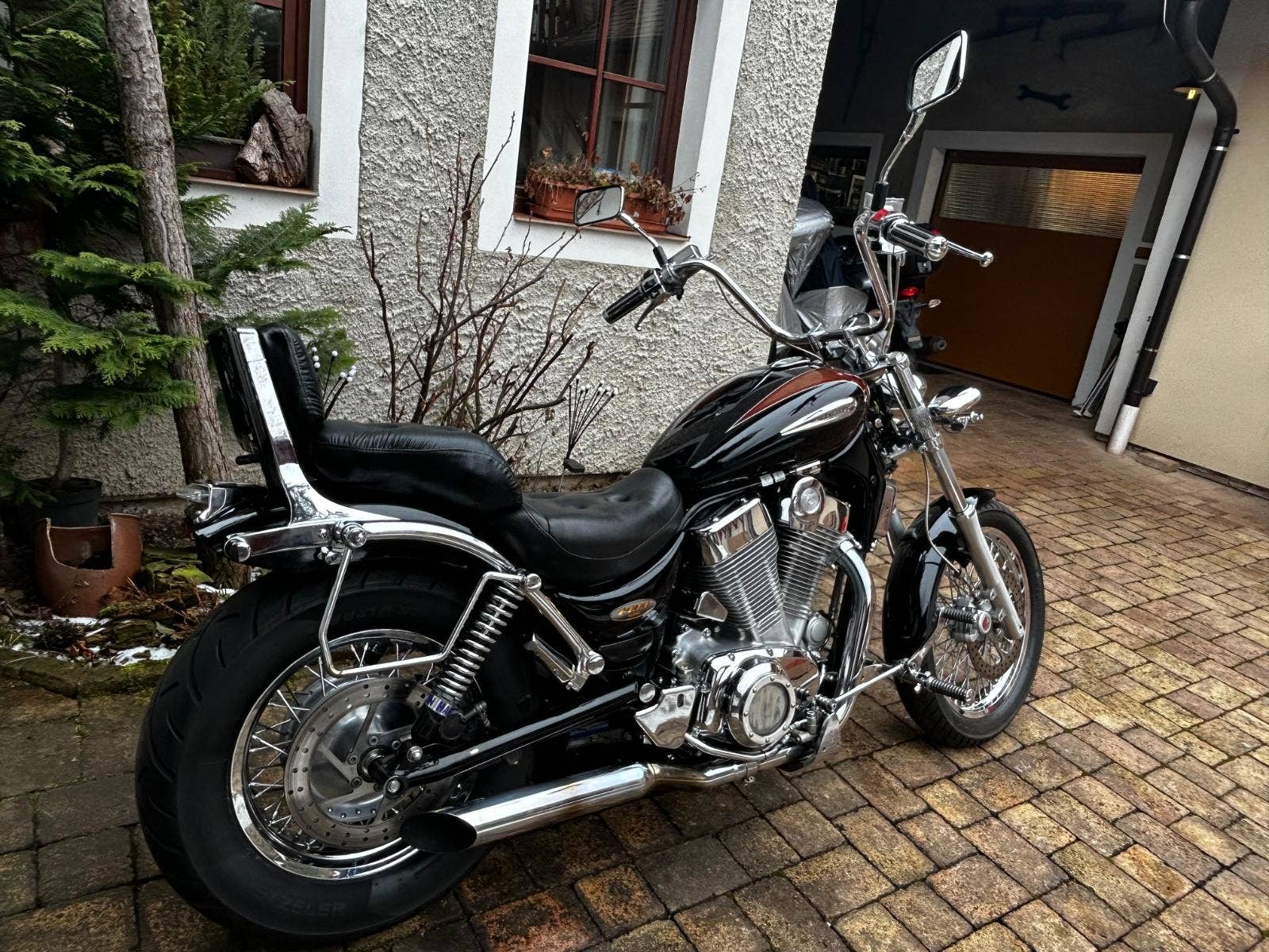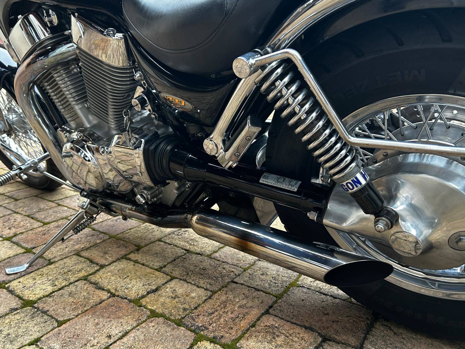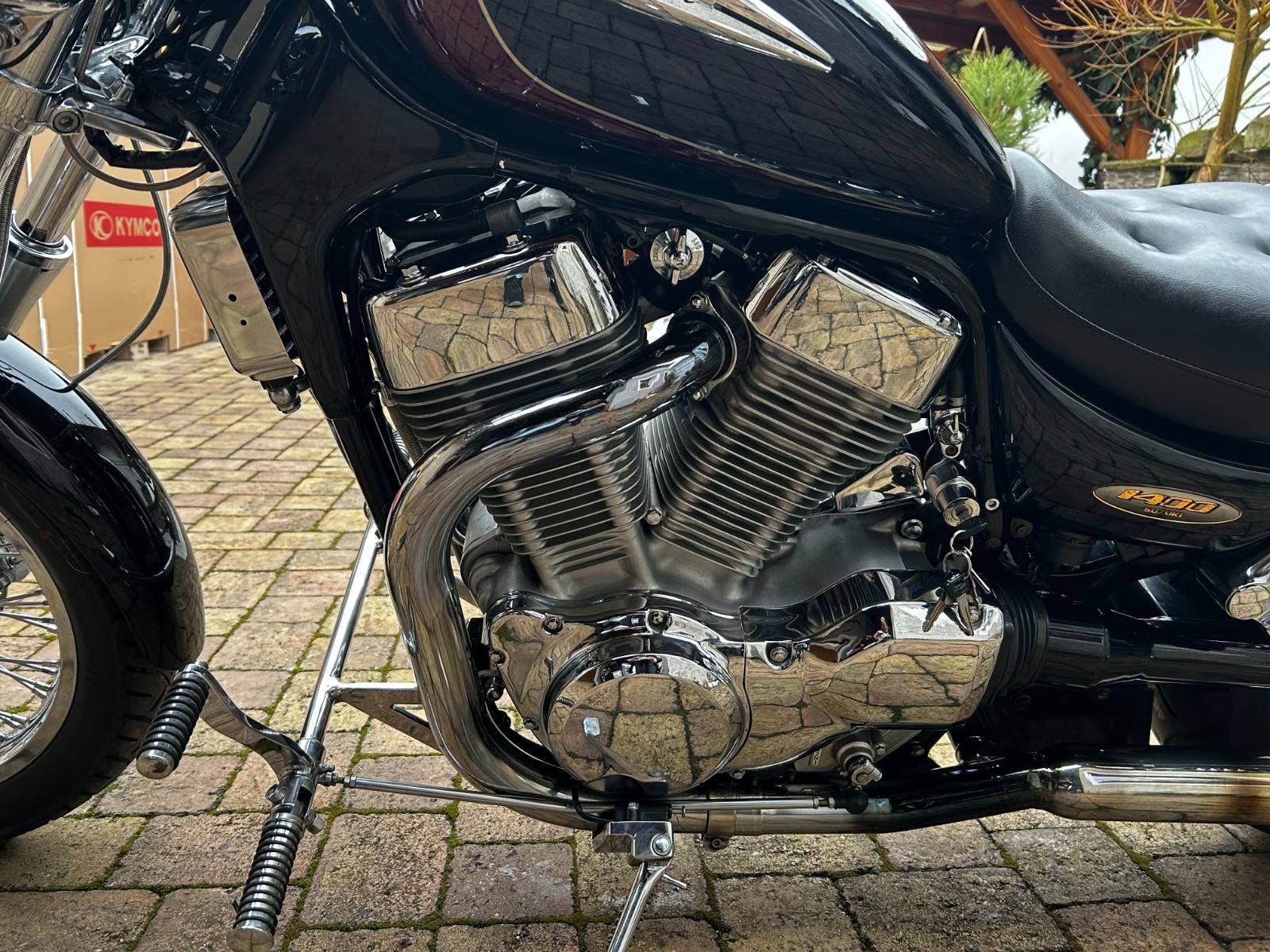 Intruder 1400 v krásném stavu a pěkně provedené úpravě. 100% chromy i lak. Doplňky – světla, blinkry, předkopy, řídítka, výfuky, průhledné víko spojky brzdy, držáky brašen atd., 5ti kvalt. Dovoz z Rakouska.